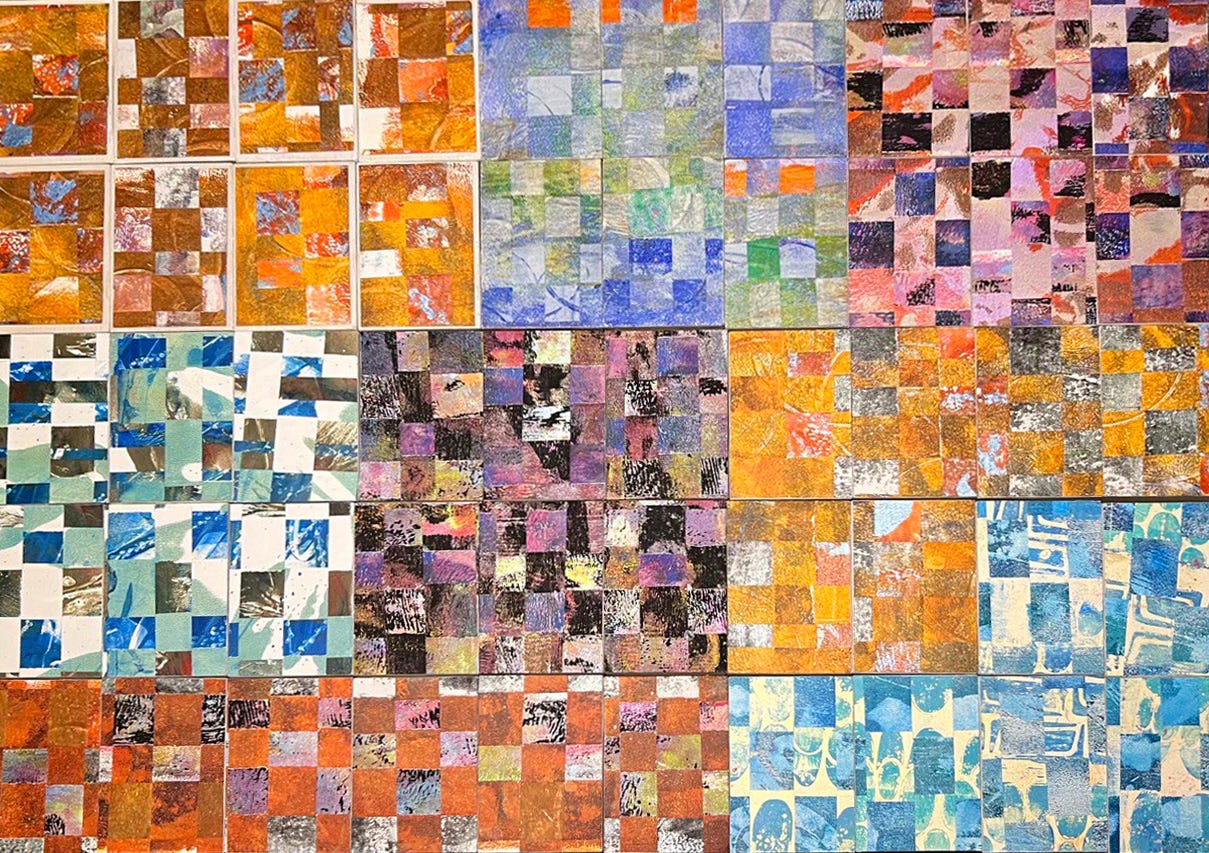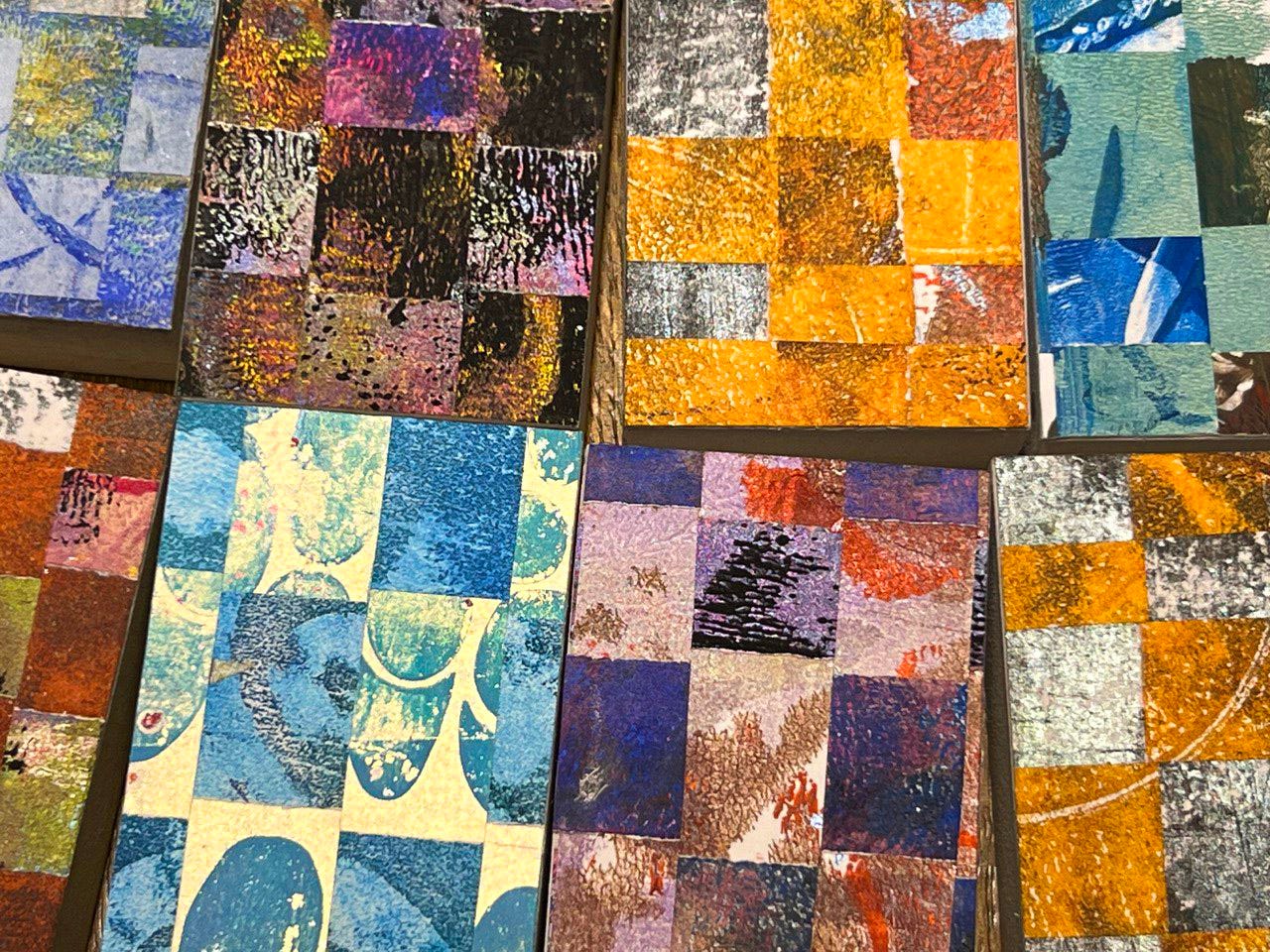 Last week I posted 50 blank Art-o-mat blocks I was prepping for artwork. After I finished sanding and painting them, I struggled for several days to come up with an idea that I liked. Sometimes after thinking a lot and then “sleeping on it” something appealing occurs to me. It was then that I remembered a series of woven papers I created a while back from acrylic monoprints that didn’t turn out as I imagined or were otherwise ugly. I hadn’t done anything with them after completing them and since I was able to find them buried in a box in my studio, I decided they would be perfect for this project.